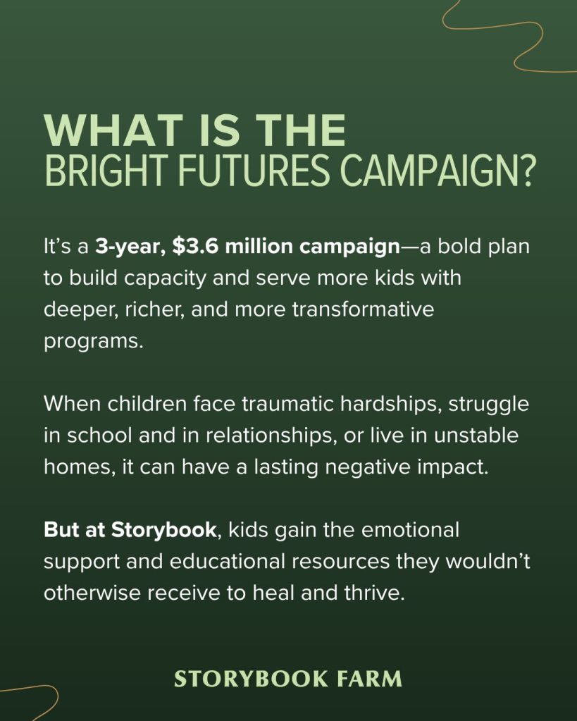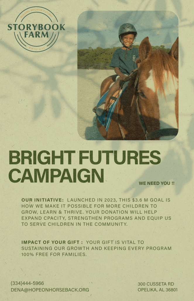 Over the course of my senior year, I’ve had many opportunities to implement different campaigns and develop media kits for local organizations. I was particularly interested in a Non-profit called Storybook Farm located in the Opelika area. This farm helps children in the community who are facing various adversities or disadvantages. Kids struggling with emotional traumas, anxiety, learning, and physical disabilities can enroll in beneficial programs at no cost to them or their families. The farm’s six programs blend STEM and literacy with the benefits of animal therapy, nature, and hands-on learning experiences. Their mission is to give ‘childhoods back to children’ and help them overcome hardships to build a brighter future.